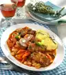 Leave the bacon in a pan without fat until crispy. Take out and let drain on kitchen paper. Heat the oil in the bacon fat. Fry the meat in it for 6-8 minutes until brown all around. Beans in boiling salted water