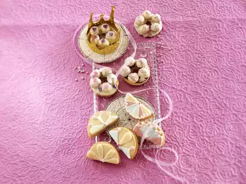 Warm the nougat mass in the closed pack for 10-15 minutes in a warm water bath. Stir the nougat and put it into a piping bag. Spray the nougat onto the curls, place 5 macadamia nuts on each, chill for about 1 hour. Chop the couverture, melt with coconut oil over a warm water bath. Dip the biscuits with the upper side into the couverture, drain and place them on a cake rack. Decorate with pink sugar, sugar pearls and hearts. Leave to dry