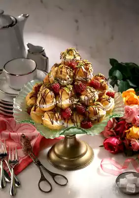 Beat cream, vanilla pulp and sugar until stiff. Pour cream into a piping bag with a star-shaped spout and squirt onto the lower choux pastry halves. Put the lid on top. Arrange profiteroles on a flat dish. Melt the couverture, fill into a freezer bag and cut off a small corner. Decorate profiteroles with raspberries, pistachios and couverture