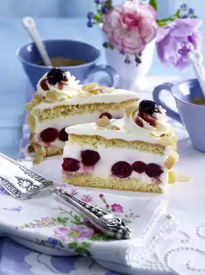 prosecco cream into the gelatine. Then stir the gelatine into the rest of the cream and chill for about 10 minutes. Beat 250 g cream until stiff. When the cream begins to gel, first stir the cream into the cream, then fold in the cherries. Pour the mixture onto the lower sponge cake, cover with the upper cake base. Chill overnight. Roast the almonds in a pan without fat, take them out and let them cool down. Whip 500 g cream and 1 packet of vanilla sugar until stiff. Pour almost half of the cream into a piping bag with a large star-shaped spout and chill. Remove the cake from the cake ring and spread the remaining cream all around. Press almond flakes to the edge and sprinkle some on the cake. Spray 12-16 cream tuffs on the cake, decorate each tuff with an Amarena cherry and sprinkle with some juice just before serving. Dust with icing sugar