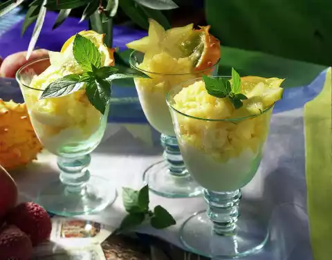Freeze the sorbet mixture in a metal bowl for about 5 hours. Stir vigorously with a whisk every 20 minutes. Divide the sorbet between 4 glasses. Serve garnished with carambola, kiwano and mint