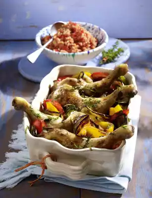 Add the aubergines, peppers and herbs to the chicken legs about 30 minutes before the end of the cooking time. Drain the rice and let it drain. Stir tomato paste and tomato pieces into the rice. Arrange chicken legs with vegetables and rice.