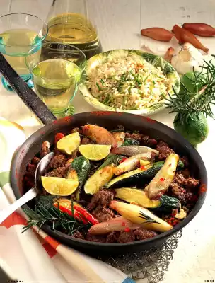 Wash lime, cut into pieces and sauté. Take everything out of the pan and fry the minced lamb in hot frying fat for 10-12 minutes while turning. Season with salt and paprika. Add vegetables again and heat up again while turning. Serve garnished with chilli and rosemary. Serve rice sprinkled with chives extra