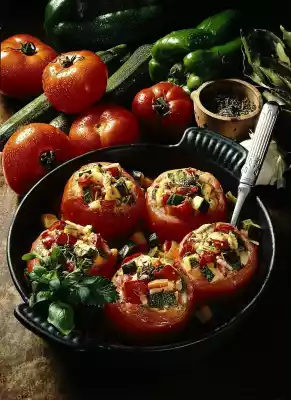 Fill 2/3 of the vegetable mixture into the tomatoes. Put the rest of the vegetables in an ovenproof dish. Add wine and bay leaf and place the stuffed tomatoes in it. Cook in the preheated oven (electric cooker: 200 °C/ gas: level 3) for about 15 minutes.
