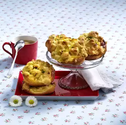 Add the egg and knead everything with the dough hooks of the hand mixer for about 4 minutes. Cover and leave to rise in a warm place for about 45 minutes. After about 30 minutes bring 440 ml milk to the boil. Stir pudding powder, 6 tablespoons of milk and 40 g of sugar until smooth and stir into the boiling milk. Let the pudding boil for about 1 minute, then take it off the stove. Line 2 baking trays with baking paper. Roll out the yeast dough on a floured work surface about 4 mm thin and cut out circles (about 8 cm Ø). Knead the remaining dough again and cover. Let dough circles rise for another 15-20 minutes with the lid on. Put 2-3 tablespoons of pudding on each circle and sprinkle with crumbles. Bake the 2 trays one after the other in a preheated oven (electric cooker: 200 °C/ convection oven: 175 °C/ gas: level 3) for about 20 minutes. Let the baked particles cool down on a cake rack.
