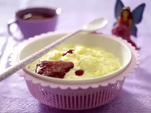 Stir the sauce powder, 2 tablespoons of sugar and 100 ml of milk until smooth. Stir into the rice pudding. Bring to the boil, simmer for 1-2 minutes while stirring. Serve lukewarm or cold with raspberry sauce and bib.