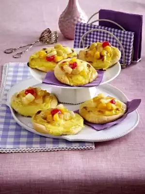 In the meantime, drain the cocktail fruits, collect the juice and fill up to 250 ml with water. Drain the fruit well on kitchen paper and spread it on the cooled down thalers. Mix cake glaze powder with fruit juice in a pot. Bring to the boil and let it boil for about 1 minute. Spread the cake glaze over the fruit from the middle and let it set for about 1 hour