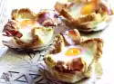 Add ham, cheese and asparagus. Mix eggs, sour cream and yoghurt, season with salt and pepper and pour into the moulds. Lightly twist in any protruding puff pastry tips. In a preheated oven (electric cooker: 200 °C/ convection oven: 175 °C/ gas: see