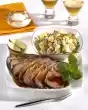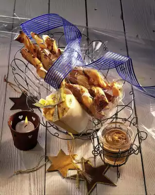 Place a piece of bacon on top of each and twist each strip spirally. Brush with egg yolk again and sprinkle with peanuts. Place on a baking tray lined with baking paper and refrigerate for about 15 minutes. Then bake in a preheated oven (electric: 225 ° C/ gas: level 4) for 10-12 minutes. Serve with dried banana chips and peanut butter