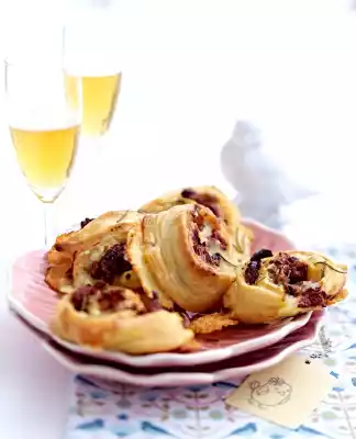 Roll everything up from the long side. Cut the dough roll with a sharp knife into approx. 12 slices. Place one cut side of each slice on the baking tray. Bake in a hot oven for about 15 minutes.