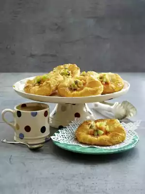 Meanwhile peel the kiwi and papaya and cut them into cubes. Boil up the jam with 3 tbsp. water for 2-3 minutes. Cover Copenhagen with the fruit and spread with the jam