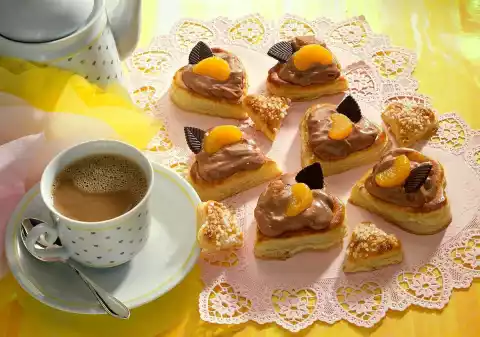 Fold mandarins, up to 12 for decorating, into the chocolate cream. Pour the cream into the 12 large hearts and decorate with the retained mandarins and chocolate flakes. Results in 12 large and 12 small hearts.
