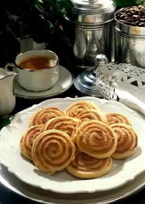 Spread the puff pastry with the marzipan mixture and roll up from the transverse side. Cut the roll into approx. 1 cm thick slices. Line a baking tray with baking paper and place puff pastry slices on top. Refrigerate the rest.