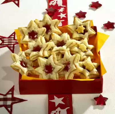 Place the puff pastry slices next to each other and let them thaw for about 15 minutes. Knead marzipan with 50 g icing sugar. Roll out marzipan on a work surface lightly dusted with 20 g icing sugar and cut out a total of 48 stars (4/6 cm Ø). In the meantime, knead the marzipan remains and roll out again. Put 3 slices of puff pastry in the fridge. Roll out 1 puff pastry slice on a lightly floured work surface (22 x 28 cm). Cut out 24 stars and place them on a baking tray lined with baking paper. Prick each star 2 times with a fork. Warm the jelly. Brush the stars thinly with jelly. Cover each star with a marzipan star and brush with jelly. Roll out 1 puff pastry disc (22 x 28 cm) and cut out 24 stars with a star cutter of the same size with an inner star. Place the outer star on the marzipan, fill the centre with some jelly (warm up again if necessary). Bake in the preheated oven (electric cooker: 225 °C/ convection oven: 200 °C/ gas: level 4) for 8-10 minutes. Take out and let cool down. Do the same with the last two puff pastry slices and the remaining marzipan stars. Place small puff pastry stars from the middle on a baking tray lined with baking paper and bake for approx. 5 minutes. If necessary, place the small stars in the middle of the large stars on the jelly for decoration.