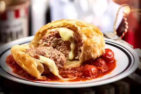 Defrost the puff pastry slices. Soak the rolls in water. Peel and finely dice onions. Wash and chop the marjoram. Chop, half onions, squeezed out roll, 2⁄3 Knead marjoram, 1 egg, 1 level tsp salt and 1⁄2 tsp pepper. Form 6 balls from the mixture and fry in 2 tablespoons of oil. Cut mozzarella into slices, dab dry.