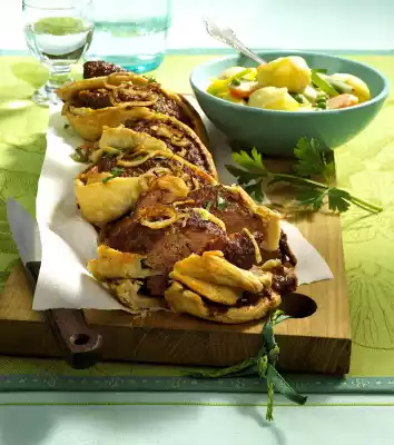 Twist both halves together to form a "cord". Place on a baking tray lined with baking paper. Bake in a preheated oven (electric cooker: 200 °C/ convection oven: 175 °C/ gas: level 3) for 30-35 minutes. Cook the carrots in boiling salted water for about 10 minutes. Add leek and peas 4 minutes before the end of cooking time. Melt 80 g butter in a saucepan. Dust with flour and sauté while stirring. Gradually add 500 ml water and milk and stir in. Bring to the boil, stir in broth and simmer for 5 minutes. Drain vegetables, rinse with cold water and drain. Wash parsley, dab dry and chop finely. Peel 2 onions and cut into rings. Heat 25 g butter and fry onion rings in it until golden brown. Stir the mustard into the béchamel and season with salt, pepper and nutmeg. Add potatoes and vegetables to the béchamel and heat up again. Garnish with onions and parsley. Serve with the vegetables