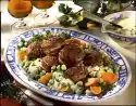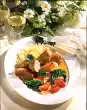 Bring to the boil, stir in broth and simmer for 5 minutes. Drain vegetables, rinse with cold water and drain. Wash parsley, dab dry and chop finely. Peel 2 onions and cut into rings. Heat 25 g butter and fry onion rings in it until golden brown. Stir the mustard into the béchamel and season with salt, pepper and nutmeg. Add potatoes and vegetables to the béchamel and heat up again. Garnish with onions and parsley. Serve with the vegetables