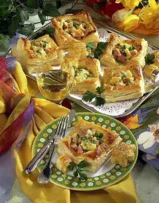 Place puff pastry slices next to each other on the work surface and allow to defrost. Let the peas thaw as well. Drain the pineapple. Cut smoked pork loin into small cubes. Grate cheese. Chop the pineapple into small cubes.