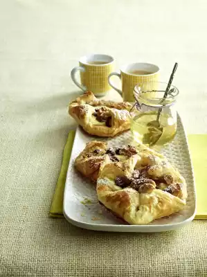 Take the puff pastry out of the fridge about 10 minutes before processing. Roughly chop the nuts. Mix with cranberries and honey. Stir crème fraiche until smooth.