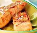 Wash the fish fillets and dab them dry. Sprinkle salmon with lemon juice, salt. Dice cod finely. Puree finely with lime juice and crème fraîche. Season with salt and pepper. Line a box form (25 cm long; 9 cm wide) with baking paper and puff pastry, letting the dough overlap.