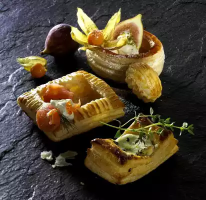 Preparation square pies: Place 2 thawed pastry sheets (see above) on top of each other, cut in half crosswise. Scrape or cut into the middle of the upper plate approx. 1 cm from the edge. Press the edge firmly with fork prongs. Spread with whisked egg yolk and bake (see above). Then loosen the lids along the marking with the tip of a knife and lift them out. Fill the pies with e.g. salmon, crème fraîche and caviar. Put the lid on top
