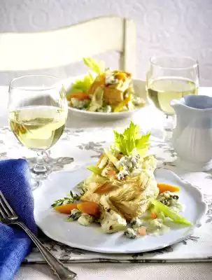 Cut an opening in each pie with a knife. Fill in the vegetables, drizzle with the sauce and sprinkle with the remaining cheese. Garnish with celery green and possibly thyme.