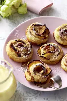 Whisk the egg yolk and 1 tablespoon of water. Carefully brush the edges of the plum roses with it. Bake in the preheated oven (electric cooker: 200 °C/ convection oven: 175 °C/ gas: see manufacturer) for 20-25 minutes