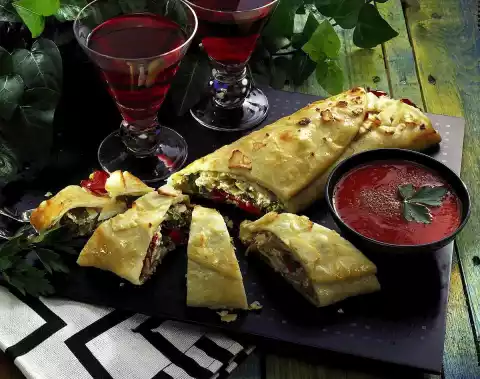 Place the vegetables in a pan without defrosting them. Fry over high heat for about 10 minutes. Stir several times. Coarsely crumble the feta cheese. Roll out the dough. Spread vegetables and cheese on top. Roll up with the help of the enclosed baking paper, press the seam.