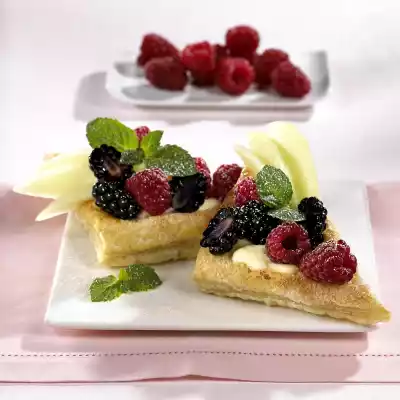 Fill the puff pastry with cream and cover with the fruit. Dust with 10 g icing sugar and decorate with mint.