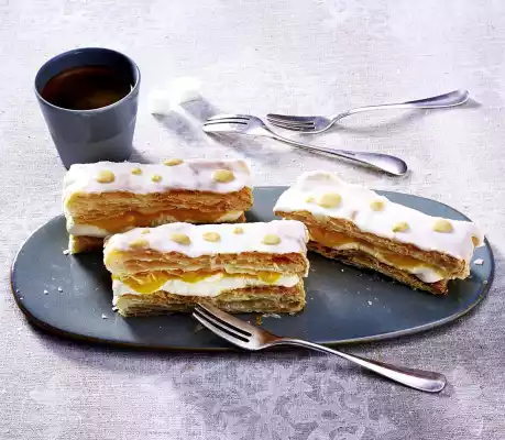 Roll out puff pastry slices approx. 1 1/2-2 cm longer. Straighten the edges if necessary. Prick the dough several times with a fork, bake in a preheated oven (electric cooker: 200 °C/ convection oven: 175 °C/ gas: see