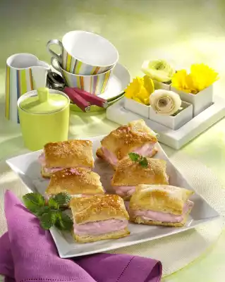 Whip the cream until stiff. Stir the rhubarb into the quark mixture. Melt the squeezed out gelatine in a small pot at low heat. Remove from the stove. Stir 4 tablespoons of the rhubarb quark mixture drop by drop into the melted gelatine. Then let it run into the rhubarb-quark mixture while stirring. Place the mixture in a cool place for 6-9 minutes until the mixture begins to gel. Fold in the cream in portions. Refrigerate for another 4-6 minutes. Pour cream with a tablespoon onto the lower puff pastry plates, place lid on top. Refrigerate for about 1 1/2 hours. Sprinkle with pink sugar and serve decorated with lemon balm