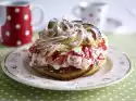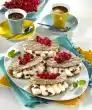 Place the mixture in a cool place for 6-9 minutes until the mixture begins to gel. Fold in the cream in portions. Refrigerate for another 4-6 minutes. Pour cream with a tablespoon onto the lower puff pastry plates, place lid on top. Refrigerate for about 1 1/2 hours. Sprinkle with pink sugar and serve decorated with lemon balm