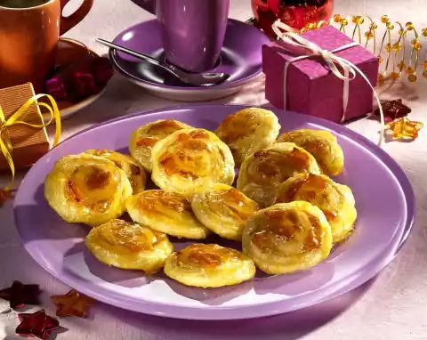 Place snails on a baking tray lined with baking paper. Bake in a preheated oven (electric cooker: 200 °C/ convection oven: 175 °C/ gas: level 3) for approx. 15 minutes. Take out and let cool down. Heat up the apricot jam, pass it through a coarse sieve and spread it on the puff pastry snails. Leave to dry