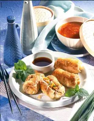 Whisk the egg yolk and cream. After about 15 minutes, brush the rolls with it and sprinkle with 3 tbsp. sesame seeds. Serve and garnish with mint if desired. Serve with soy sauce and sweet and sour Asian sauce