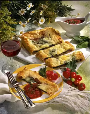 Unroll the puff pastry and place it on a baking tray with the baking paper provided. Cover dough with ham in the middle. Fold over the edges of the dough to form a rectangular strand. Fill the middle with spinach and sprinkle with cheese. Mix egg yolk and cream and brush the edges of the dough with it. Bake in the preheated oven (electric oven: 200 °C/ gas: level 3) for 15-20 minutes. In the meantime, put the chunky tomatoes in a saucepan and heat them up. Add tomato paste and ketchup and stir in. Season to taste with salt and pepper. Wash parsley, dab dry, pluck leaves from the stalks and chop finely.