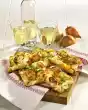 In the meantime, put the chunky tomatoes in a saucepan and heat them up. Add tomato paste and ketchup and stir in. Season to taste with salt and pepper. Wash parsley, dab dry, pluck leaves from the stalks and chop finely. Finally sprinkle over the sauce. Cut puff pastry strand into pieces, arrange on a plate and serve with the sauce. Garnish as desired with cherry tomatoes and parsley
