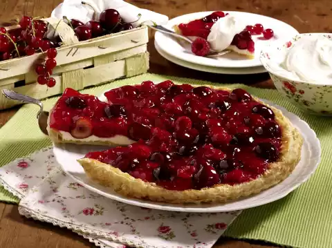 Place the puff pastry slices on top of each other and roll out into a circle (28 cm Ø) on a floured work surface. Place in a greased, floured tart mould with lift-off base. Whisk the egg yolk and milk and spread the edge of the puff pastry. Prick the base several times with a fork and bake in a preheated oven (electric range: 175 °C/ convection oven: 150 °C/ gas: level 2) for approx. 15 minutes. Remove the finished base and let it cool down. In the meantime, soak the gelatine in cold water and squeeze it out. Dissolve the gelatine, stir in approx. 2 tablespoons of quark cream and stir into the remaining quark cream. Spread the cream on the base and smooth it down. Boil up apple juice, 150 ml water and sugar. Stir red fruit jelly powder and 5 tablespoons of water until smooth and bind the liquid, bring to the boil again. Carefully fold the prepared fruit into the groats.