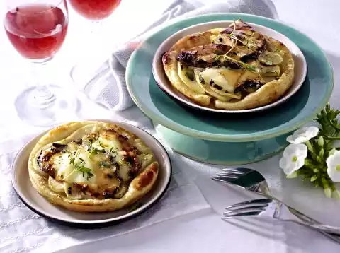 Prick the puff pastry several times with a fork, cover with slices of pear and cheese, drizzle with honey. Bake in the preheated oven (electric cooker: 200 °C/ convection oven: 175 °C/ gas: see manufacturer) for 25-35 minutes. Remove and let cool down a little. Wash the thyme, shake dry and place 1 stalk on each tartlet. Serve hot or cold