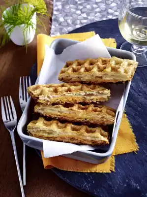 Heat the waffle iron (approx. 12 x 21 cm; 2 waffles) and spread a thin layer of fat on them. Bake dough sandwiches one after the other for about 10 minutes until golden brown. Halve the waffles and serve warm