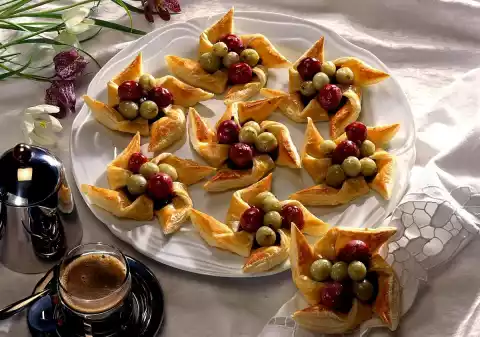 Cut all corners about 4 cm deep and fold half of each corner to the middle. Put 1 tablespoon of gooseberries in the middle and place them on 2 baking trays lined with baking paper. Mix egg yolk and cream and brush the wings of the windmills with it.