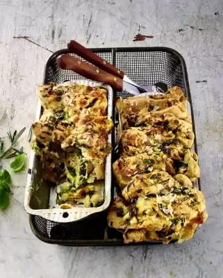 Preheat oven (electric cooker: 200 °C/circulating air: 175 °C/gas: see manufacturer). Grease a box mould (25-30 cm long; approx. 1 3⁄4 l capacity). Place vertically. Layer pieces of dough in the mould.