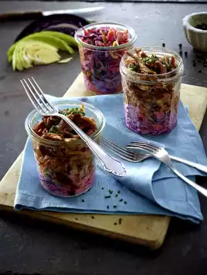 Using two forks, pluck the meat into small pieces. Mix the meat with the barbecue sauce. Arrange salad and meat in glasses.