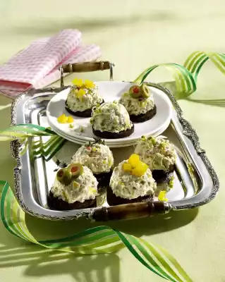 Finely chop the remaining olives. Wash the sprouts and drain well. Put 1-2 tablespoons of paprika aside for garnishing. Mix the rest with ricotta and olives. Season with salt and pepper. With a small ice cream scoop Bällc