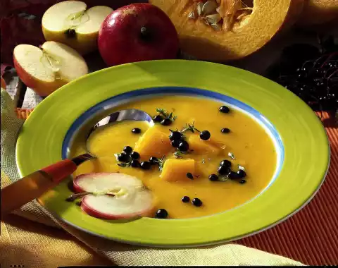 Dice apple quarters. Heat oil in a pan and sauté onions. Add pumpkin, potatoes and apples, fry briefly and deglaze with broth and apple juice. Bring to the boil, cover and simmer over medium heat for 20-25 minutes.