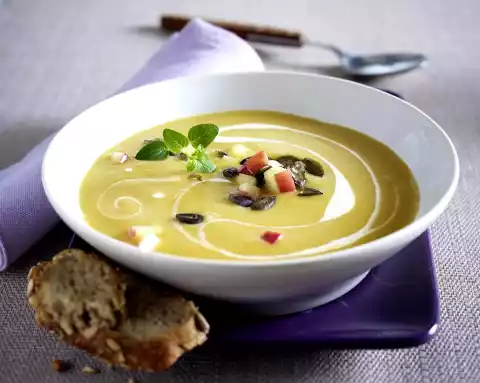 Heat 1 tablespoon of olive oil in a frying pan. Steam apple cubes for 1-2 minutes until translucent. Mix sour cream and cream until smooth. Puree the soup and season to taste with salt, pepper, a little sugar, nutmeg and vinegar. Arrange in soup bowls.