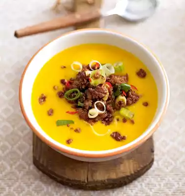 Finely puree the soup with a hand blender. Season to taste with salt and pepper. Serve the pumpkin soup with chopping mix.