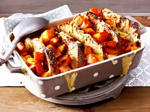 Bake the pumpkin and bread casserole in a hot oven for 40-50 minutes. After about 15 minutes pour the remaining cream milk over the slices of bread.