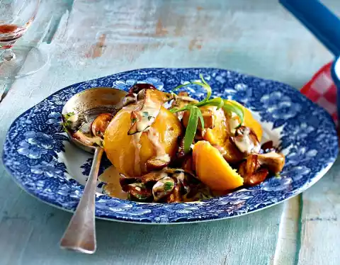 For the dumplings, peel and wash the potatoes, cover and cook in boiling salted water for about 20 minutes. Wash the pumpkin, quarter it, remove the seeds, cut it into slices and dice it roughly with the skin. Weigh 300 g pumpkin flesh and after about 10 minutes add to the potatoes, cook.