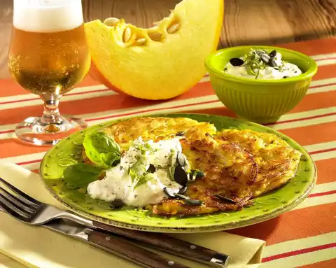 Season with salt and pepper. Fry 12 buffers in portions in hot oil while turning for about 5 minutes. Serve with the dip. Sprinkle with pumpkin seeds and garnish with basil.