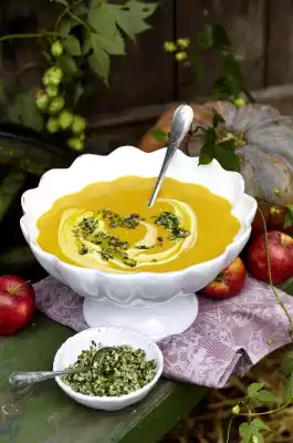 Puree the soup with a hand blender. Season to taste with salt and pepper. Serve with crème fraîche and pesto.